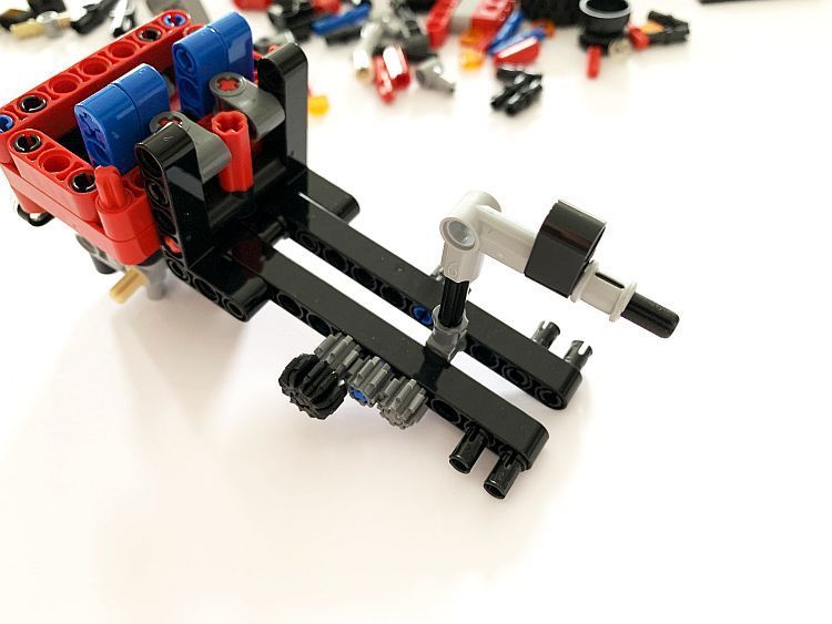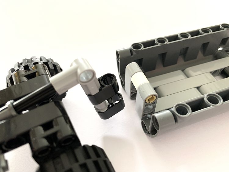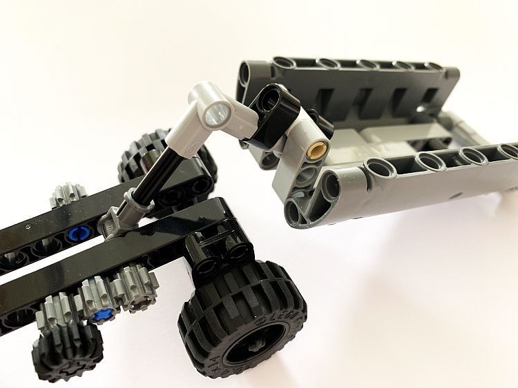 Ein kleines Highlight ist die Lenkung. Eigentlich ein Wunder, dass soetwas bei der Preisklasse überhaupt verbaut wurde. Die Funktion kommt sogar ohne Zahnrad aus und wird nur über zwei halbe übereinander gelegte 5er-Liftarme angesteuert. Total simpel – aber es geht.