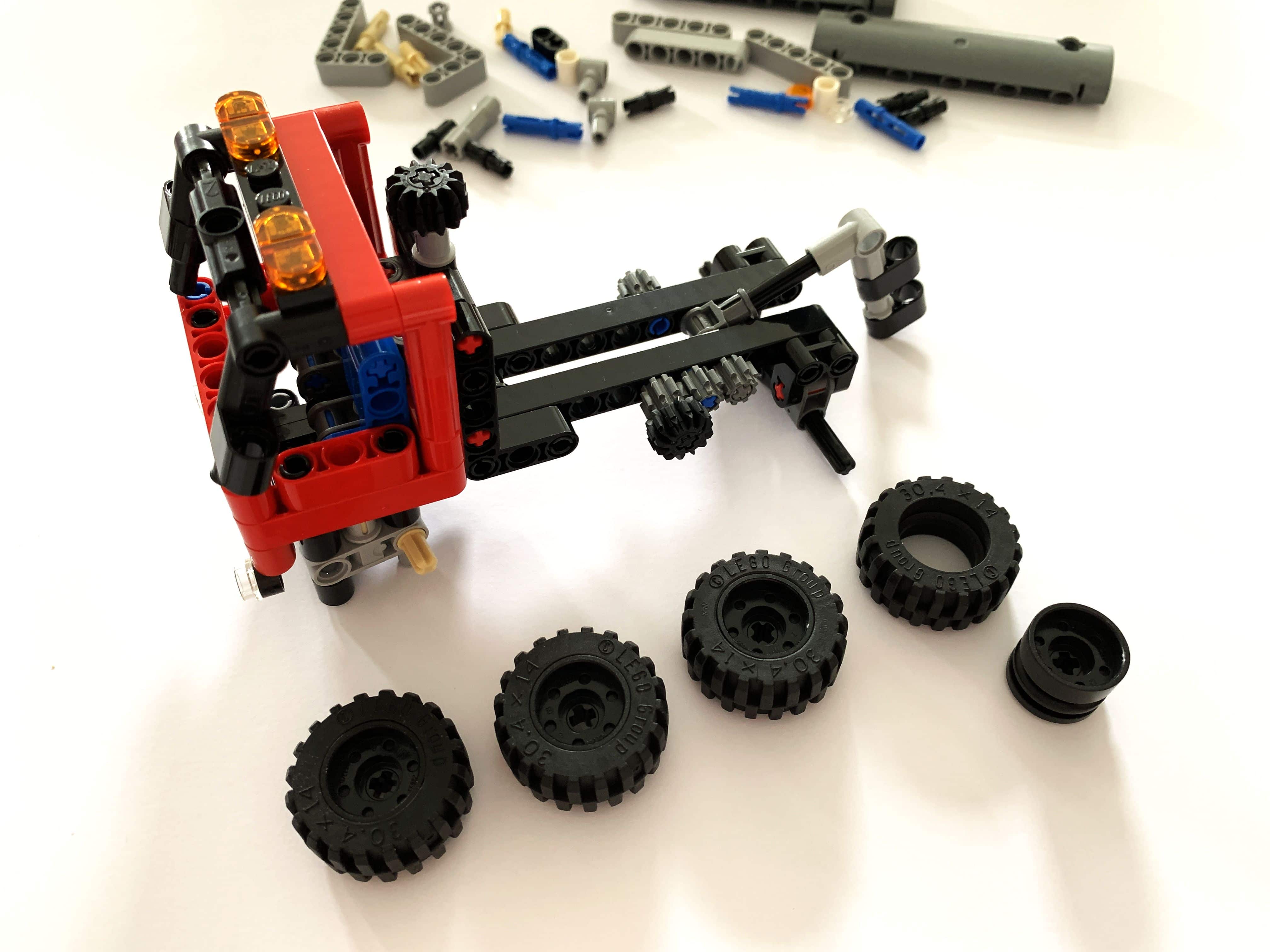 Bevor die Mulde als finaler Akt zusammengesteckt wird, werden bereits die Reifen montiert.