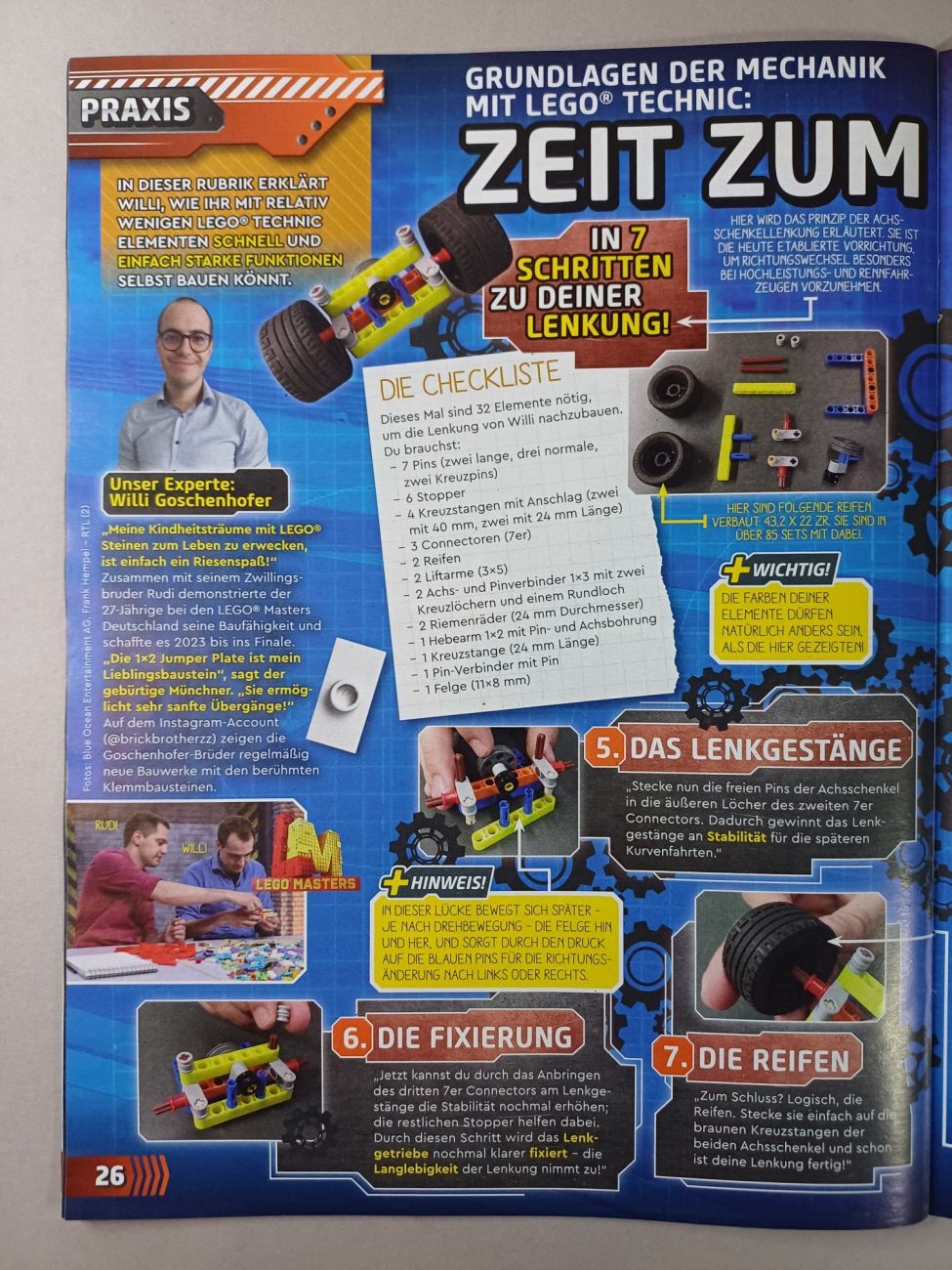 Bei den vier Postern gibt es zwar kein passendes zum Extra, aber dafür mehrere Fahrzeuge und ein U-Boot. Eine kleine Variante davon würde ich total gerne mal im Magazin sehen! Und wie immer gibt es hier auch einen Praxis-Beitrag von dem LEGO Masters Kandidat Willi, dieses Mal mit einer „Achsschenkellenkung“.