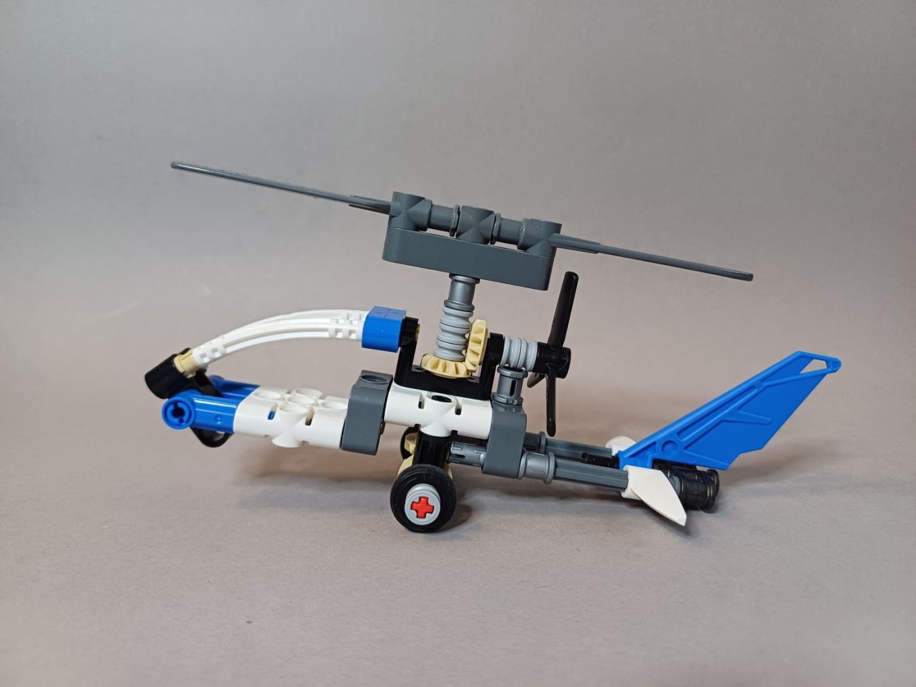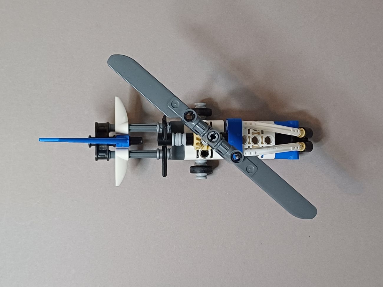 Der Aufbau des Gyrocopters ist schnell gemacht und sieht fertig deutlich besser aus als erwartet. Das Vorschaubild der letzten Ausgabe war etwas unvorteilhaft und hat es aus einem Winkel gezeigt, bei dem es dünner aussieht. Die Farben des Modells gefallen mir auch, da Blau, Weiß und Grau gut zusammen passen, jedoch stört die rote Achse ein bisschen. Die Proportionen des Modells finde ich auch gut gelungen, bis auf den großen Rotor, der durch den großen Technic Beam viel zu dick wirkt. Jedoch muss es so gebaut sein, da sonst der zweite Propeller keinen Platz hätte.