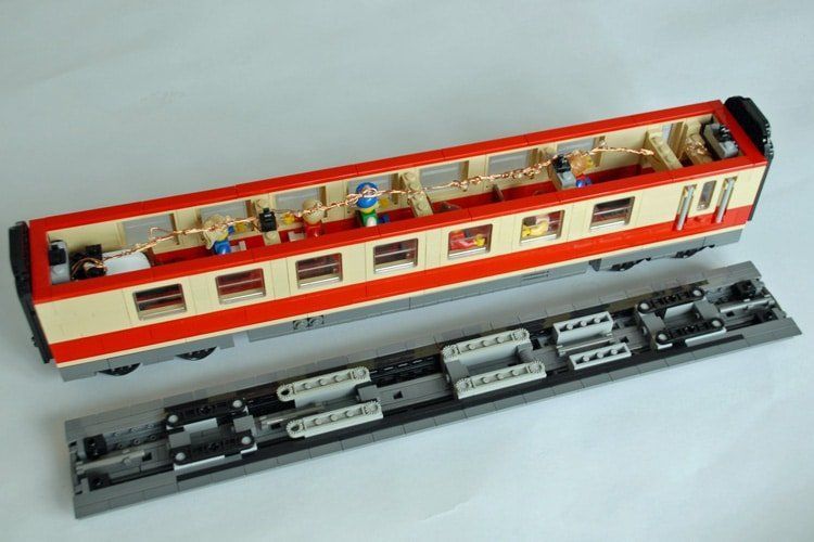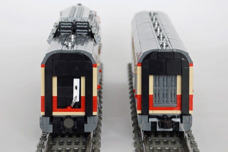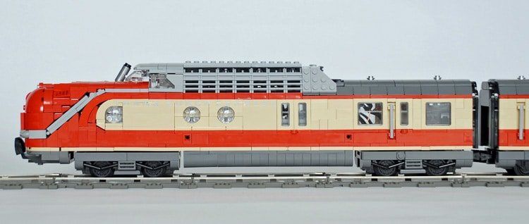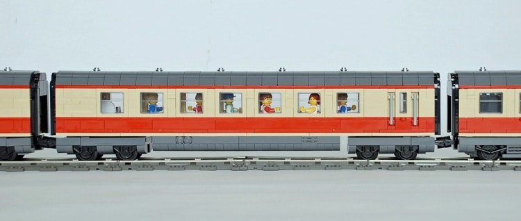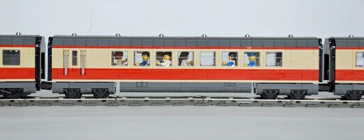 Das Dach des Triebwagens hat er in zwei Farbvarianten gebaut, in Dunkelgrau soll es die durch den Dieselruß verschmutzte Version darstellen. In den Waggons ist Platz für Minifiguren.