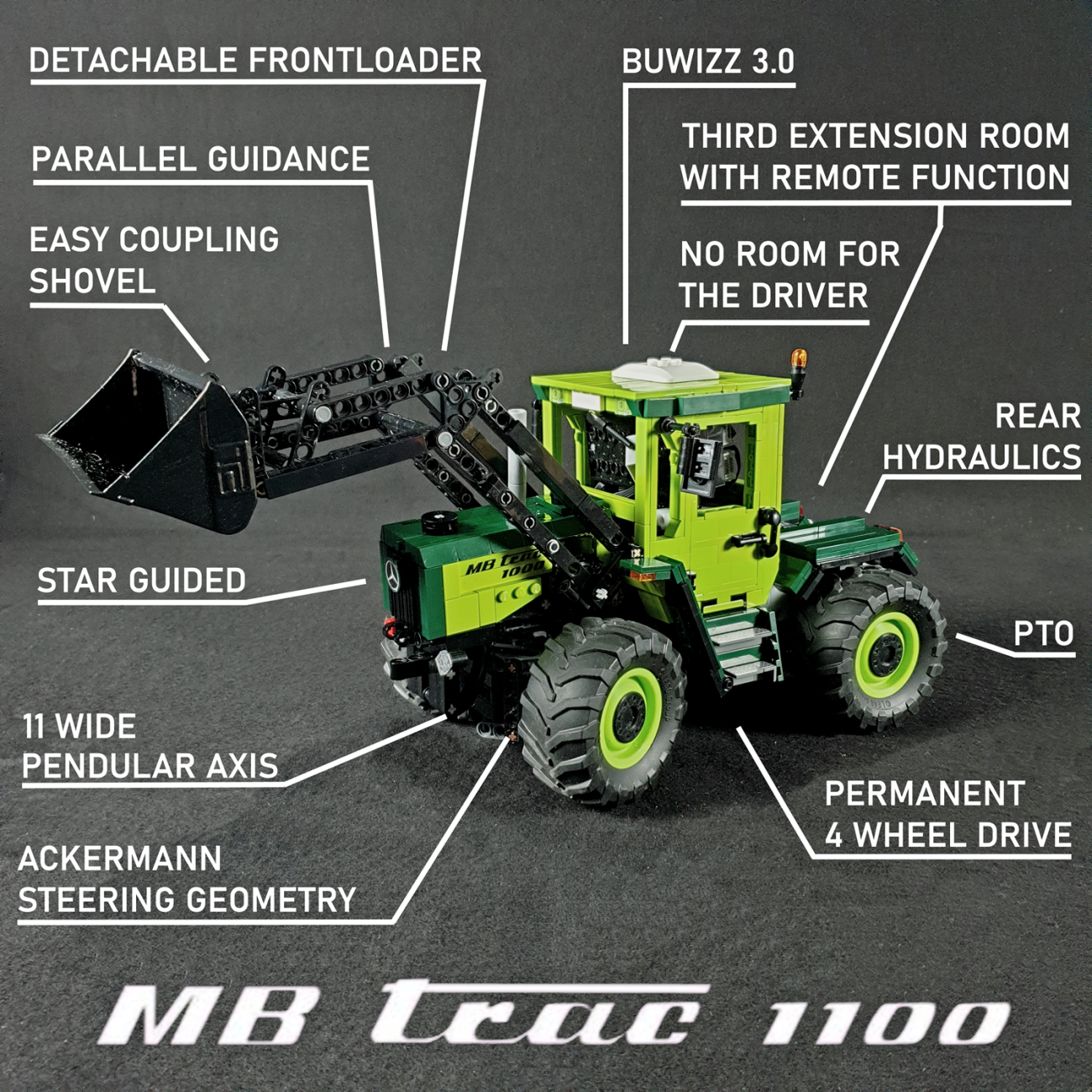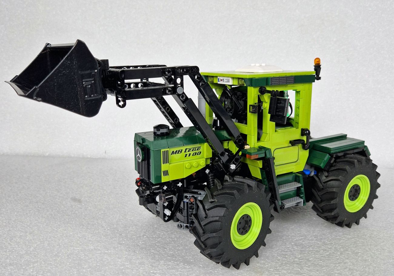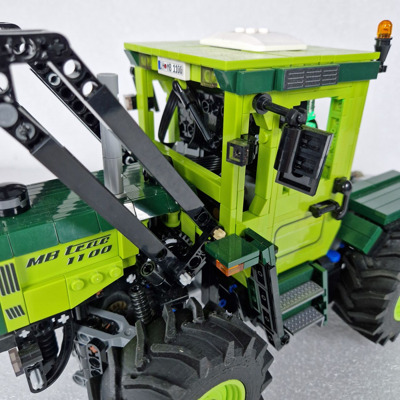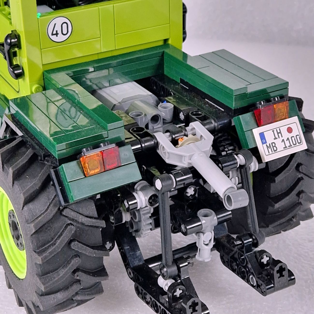 Die Kombination aus klassischen LEGO Steinen und Technic-Elementen gefällt mir sehr gut. Dieser MB Trac kann natürlich nicht nur vor-zurück und rechts-links fahren, sondern hat auch noch einen voll funktionsfähigen Frontlader sowie einen Heck-Kraftheber. Alles wird über einen Buwizz samt dazugehörigem Motor, PF-Komponenten und drei Brickengine Motoren gesteuert.