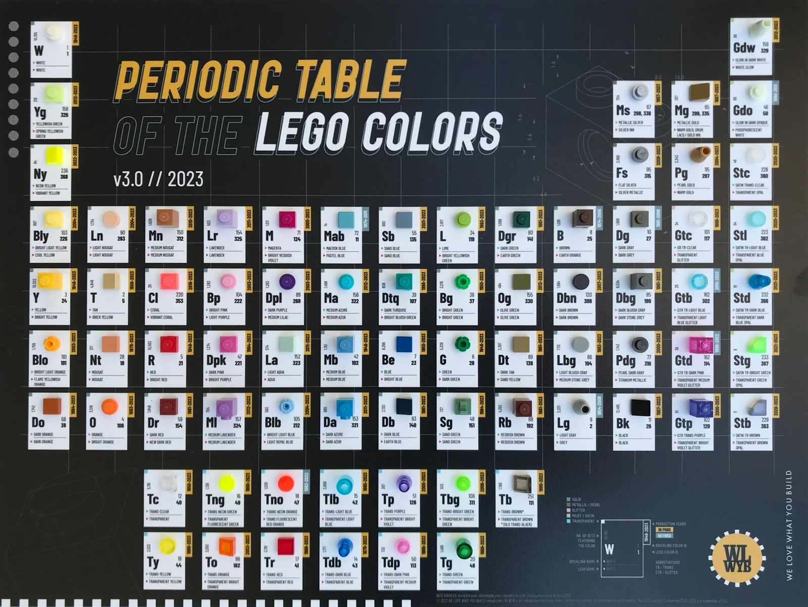 Das Periodic System of LEGO Colours kann übrigens in seiner mittlerweile 3. Version weiterhin bestellt werden, hier fallen ebenfalls 49,99$ an.