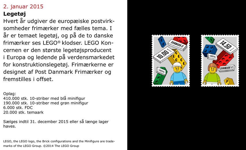 Happy New Year! Post Danmark announced today that there are two brand-new stamps available featuring LEGO® minifigures and blocks. The stamps can be purchased at post offices from January 2nd. „When it comes to toys, we do not find something that is bigger and more popular than just Lego brick“, said Martin Pingel, Design Director at Post Denmark Stamps in a press release. „It is in every way an international success story that we are proud to include in the Danish stamp universe“, he added.