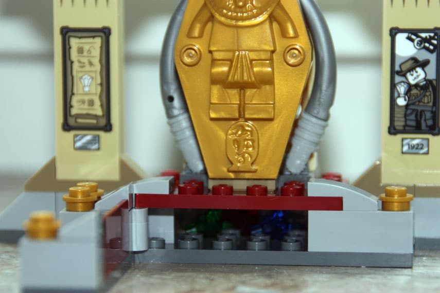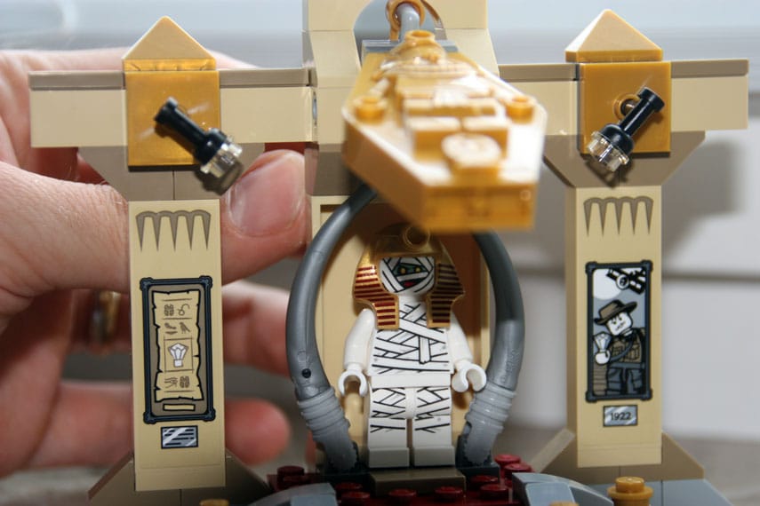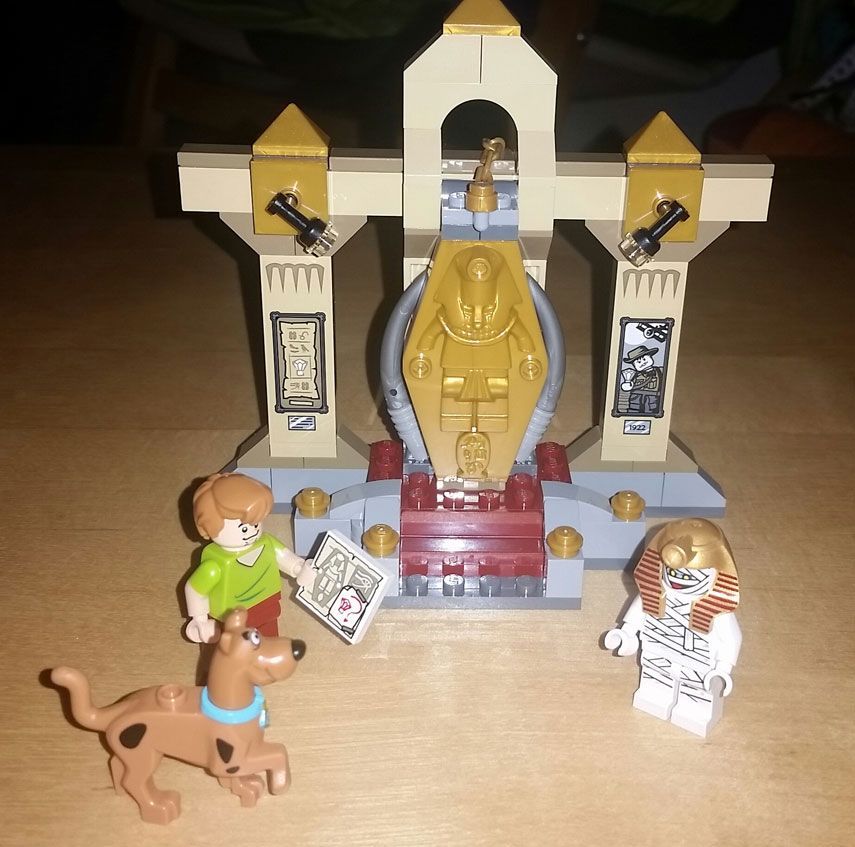 Der Spaß beim Aufbauen kam trotz der wenigen Steine nicht zu kurz, da selbst bei dem kleinsten Set nette Features verbaut wurden. So lässt sich die Mumie in dem Sarkophag verstecken, welcher sich über eine Kette, an deren Ende ein Hamburger befestigt ist, öffnen lässt. Ja, ihr habt richtig gehört: ein Hamburger. Desweiteren lässt sich der Fuß des Podestes mit dem Schatz des Pharaos aufklappen. Abschließend gilt es noch zu sagen, dass zu dem Set drei Minifiguren gehören: Shaggy, Scooby Doo (stehend) und die Mumie.