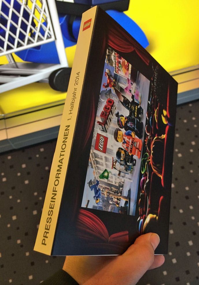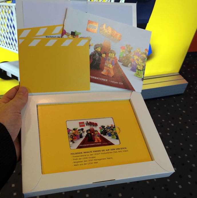 Passend zum Kinostart des THE LEGO MOVIE im April gab es für die Journalisten in diesem Jahr ein entsprechend gestaltetes Presse-Kit. Neben einem Booklet (15 Seiten) enthält das Set einen USB-Stick im Scheckkarten-Format, ebenfalls ganz im Zeichen des Kinofilms. Auf dem USB-Stick findet sich ausführliches Pressematerial zu allen Produkten des ersten Halbjahres 2014 in Form von Pack-Shots, PR-Bildern und Videos, u.a. von den Designern der jeweiligen Produkte. Zusätzlich enthält die Speicherkarte aktuelle Informationen des Unternehmens. Ein Großteil der Informationen sind zweisprachig – deutsch und englisch.