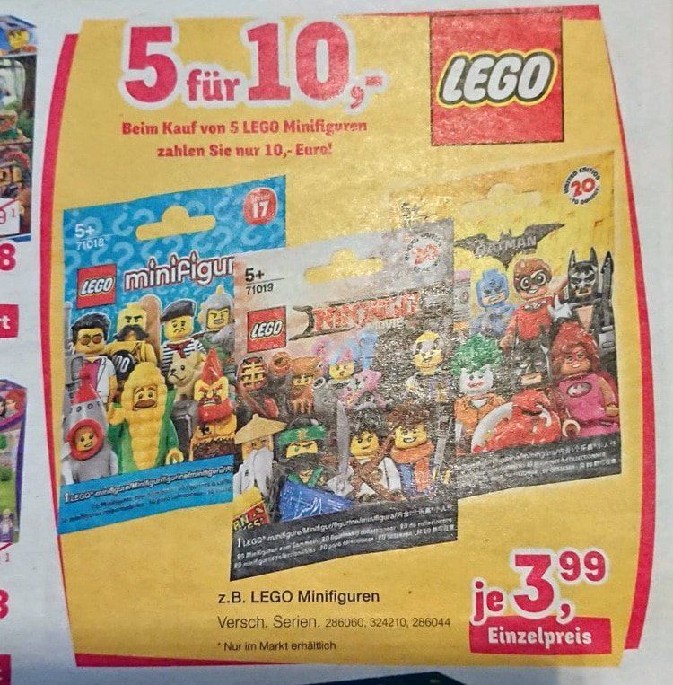 PROMOBRICKS Leser Mike hat uns informiert, dass es bei ToysRUs Deutschland vom 18. bis 21. Dezember 2017 wieder einige LEGO Minifiguren zum Sonderpreis gibt. Laut Prospekt stehen folgende Sammelserien zur Auswahl: die LEGO Minifiguren Serie 17 (71018), die erste LEGO Batman Movie Minifiguren Serie (71017) und die LEGO Ninjago Movie Minifiguren (71019). Fünf Blindbags kosten jeweils zehn Euro, was einem Rabatt von 50 Prozent auf den regulären Verkaufspreis von 3,99 Euro pro Blindbag entspricht.