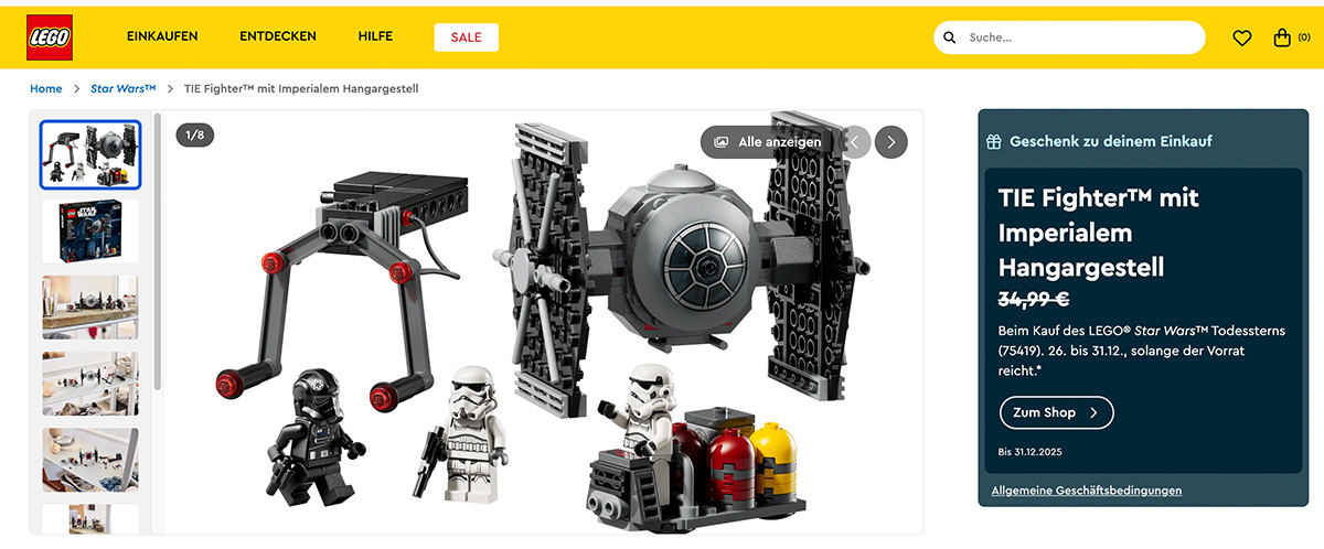 Der am 24. Dezember 2025 gestartete Weihnachts-Sale im LEGO Online-Shop geht in die nächste Runde. Neben zahlreichen LEGO Sets mit ordentlich Rabatt und unserem Gutschein-Code für eine weitere Gratis-Zugabe gibt es aktuell noch doppelte Punkte auf ausgewählte Sets, sowie zum Kauf neuen LEGO Star Wars Todesstern auch noch das exklusive TIE Fighter GWP. Ab 85 Euro Einkauf gibt es zudem das Riesenrad mit dem Feuerwerk als Gratis-Zugabe. Unser Gutschein-Code greift ab 150 Euro Mindesteinkauf, so so dass ihr dann gleich zwei GWP im Warenkorb liegen haben könnt.