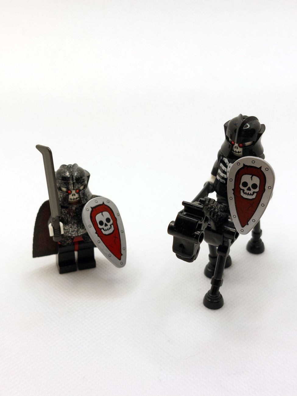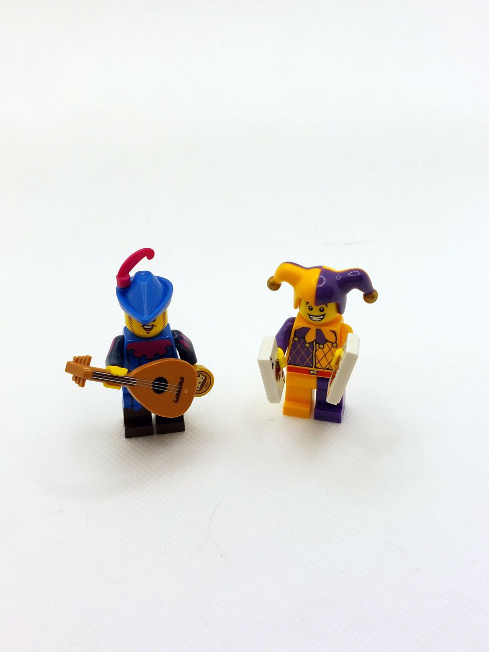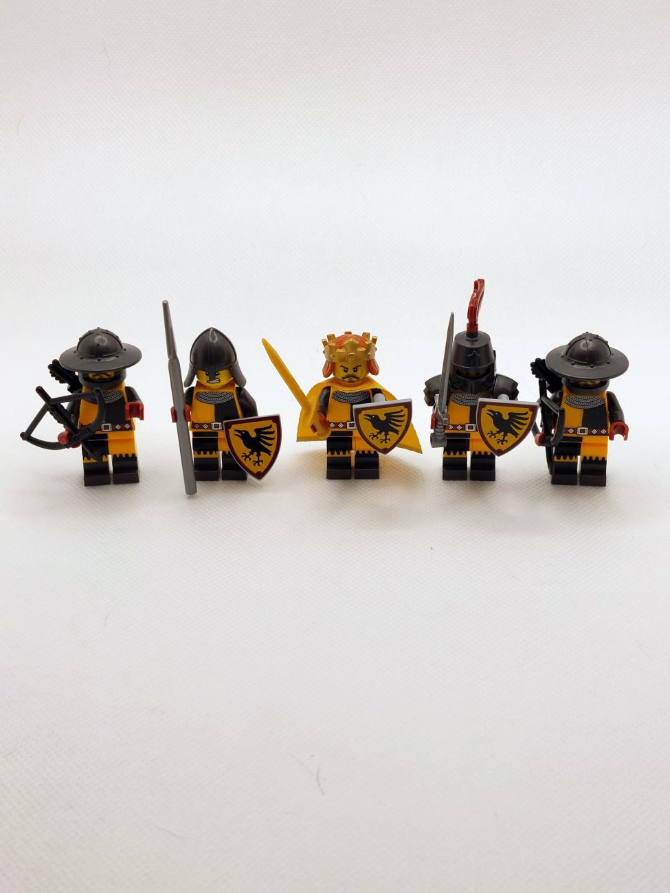 Beginnen werde ich mit dem größten Anteil der Figuren, den Crown Knights aus der Fantasy Era Reihe. Diese beherrschten unsere große Königsburg, unter der Führung des Königs in goldener Rüstung, einer Königin, und einer Prinzessin. Diese Figuren stammen alle aus den originalen Fantasy Era Sets von LEGO, genauso wie die Zwerge unter der Führung ihres Königs. Diese sind in unserer Geschichte technologisch fortgeschrittener, und dementsprechend mit starken Kriegsmaschinen ausgerüstet, so zum Beispiel mit Ballisten oder einem Ornithopter. Zu den Crown Knights in der Burg kamen noch die neueren Versionen, die Pink Crown Knights (oder auch Ritter der gelben Burg), aus der CMF-Serie 22. Da die Figur eigentlich ein Kind in Ritterkostüm darstellen soll, mussten wir auch diese modifizieren. Dual-molded Beine in hellgrau/schwarz passen perfekt als Beine, dann noch Arme, Köpfe und Helme tauschen, und schon sehen sie wie richtige Ritter aus. Doch wir nutzten auch Figuren aus anderen CMF-Serien der letzten Jahre, dort sind wirklich viele unterschiedliche Mittelalterfiguren erschienen, so auch die äußerst bekannten und beliebten Rabenritter (Tournament Knight aus Serie 20). Von diesen konnten wir über einen längeren Zeitraum ein kleines Heer zusammensammeln, und da sie zu unseren Lieblingsrittern gehören, bekamen auch sie eine besondere Rolle in unserem Moc. Sie befinden sich in der Burg als Besucher, und helfen bei der Verteidigung dieser. Ihr Fürst befindet sich während dem Angriff im Bergfried der Burg, und befehligt von dort seine Truppen auf den Mauern und im Hof. Wichtig bei der Customisation der Rabenritter ist, dass für diese eine seltenere Helmfarbe genutzt wird, die es nur in den Sets der Kingdoms Reihe gab. Wer also seinen Rabenritter unterschiedliche Helme geben will, der muss, genauso wie wir, auf die Kingdoms-Sets zurückgreifen. Weiterhin haben wir einige Hofdamen, sowie zur Unterhaltung der Burgbewohner den Barden aus Serie 22 und den Gaukler aus Serie 13 verwendet.