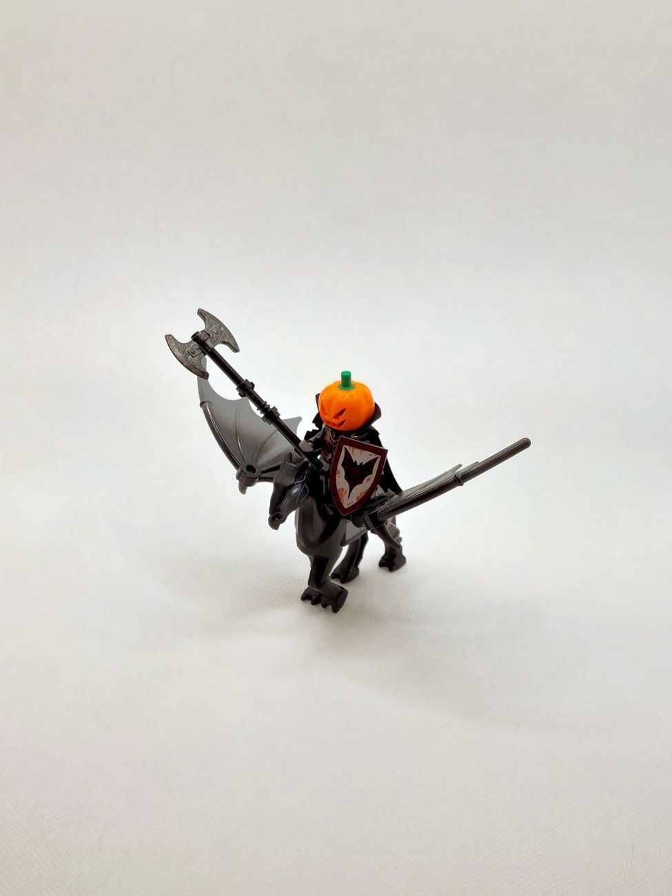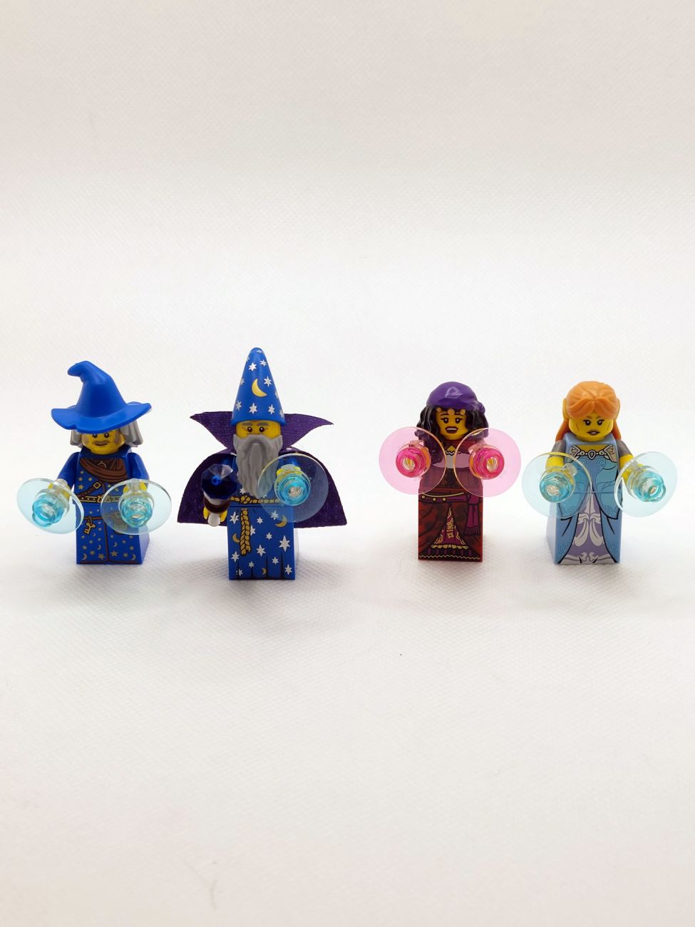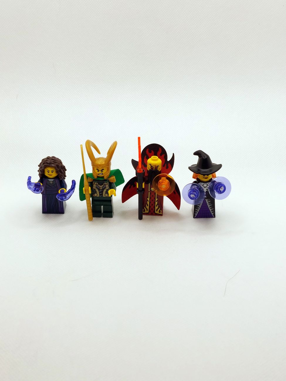 Um all diese größeren Fraktionen zu unterstützen, brauchten wir natürlich auch einige einzigartige Figuren. Unsere erste Idee dafür waren viele unterschiedliche Zauberer, sowohl auf guter, als auch auf böser Seite. Benutzt haben wir dafür zum Beispiel den exklusiven Zauberer aus dem BaM-Turm (den euch Justin regelmäßig vorstellt), den Zauberer aus der CMF 12, einen bösen Zauberer aus der CMF 13, die Wahrsagerin aus der CMF 9, den bösen Magier aus dem Fantasy Era Set 7093 (Turm des bösen Magiers), die Nexo Knights Figur Jestro aus den Sets 70316 und 70323, die Eiskönigin aus der CMF 16, die Elfenkriegerin aus der CMF 17, die Evil Witch aus der Fantasy Era Reihe, sowie die aktuellere Version aus dem BaM-Turm, sowie Loki aus einem der Marvelmagazine aus dem Jahr 2022. Um auch deren Zauberkräfte darstellen zu können, nutzten wir Trans Clear Teile, auf welche wir round dishes in verschiedene Trans-Farben bauten, um unterschiedliche Zaubersprüche und magische Fähigkeiten darzustellen. Neben Zauberern bauten wir auch natürlich auch andere einzigartige Figuren, so baute ich beispielsweise Genn Greymane aus World of Warcraft als General der Crown Knights. Mein Bruder baute noch einen untoten Reiter mit Kürbiskopf, genannt Jack O’Lantern.