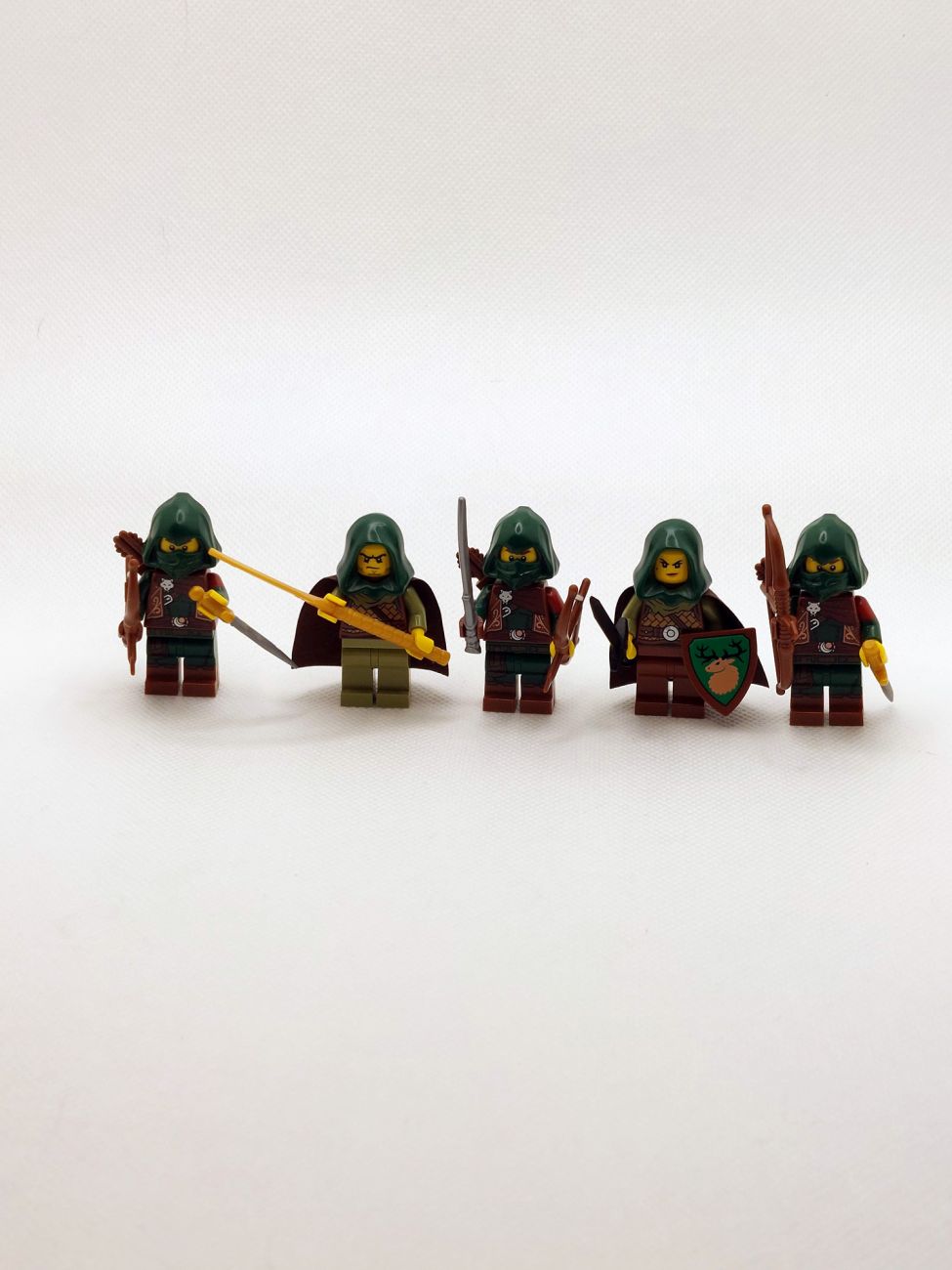 Wenn wir schon von Wikingern sprechen, auch einer der Torsos aus dem Creator Wikingerschiff fand Einsatz in einem unserer Heere: Den Rogues. Auf die Idee für diese kamen wir durch die gleichbenannte CMF-Figur aus Serie 16, und da ich parallel dazu die „The Witcher“-Bücher las, erinnerte mich die Figur sofort an die Scoia’tael aus den Büchern. Da diese Figur mittlerweile nur schwer zu bekommen ist, ergänzten wir unsere Rogues mit Custom Versionen, und hier kommen die Wikinger ins Spiel: Der olivfarbene Torso einer der Figuren passt perfekt zu den Rogues, die sich im Dschungel verstecken, um die anrückenden Ritter zu überfallen. Diesen gaben wir dann noch passende Kapuzen und Forestmen-Schilde, und fertig war unser nächstes Heer.