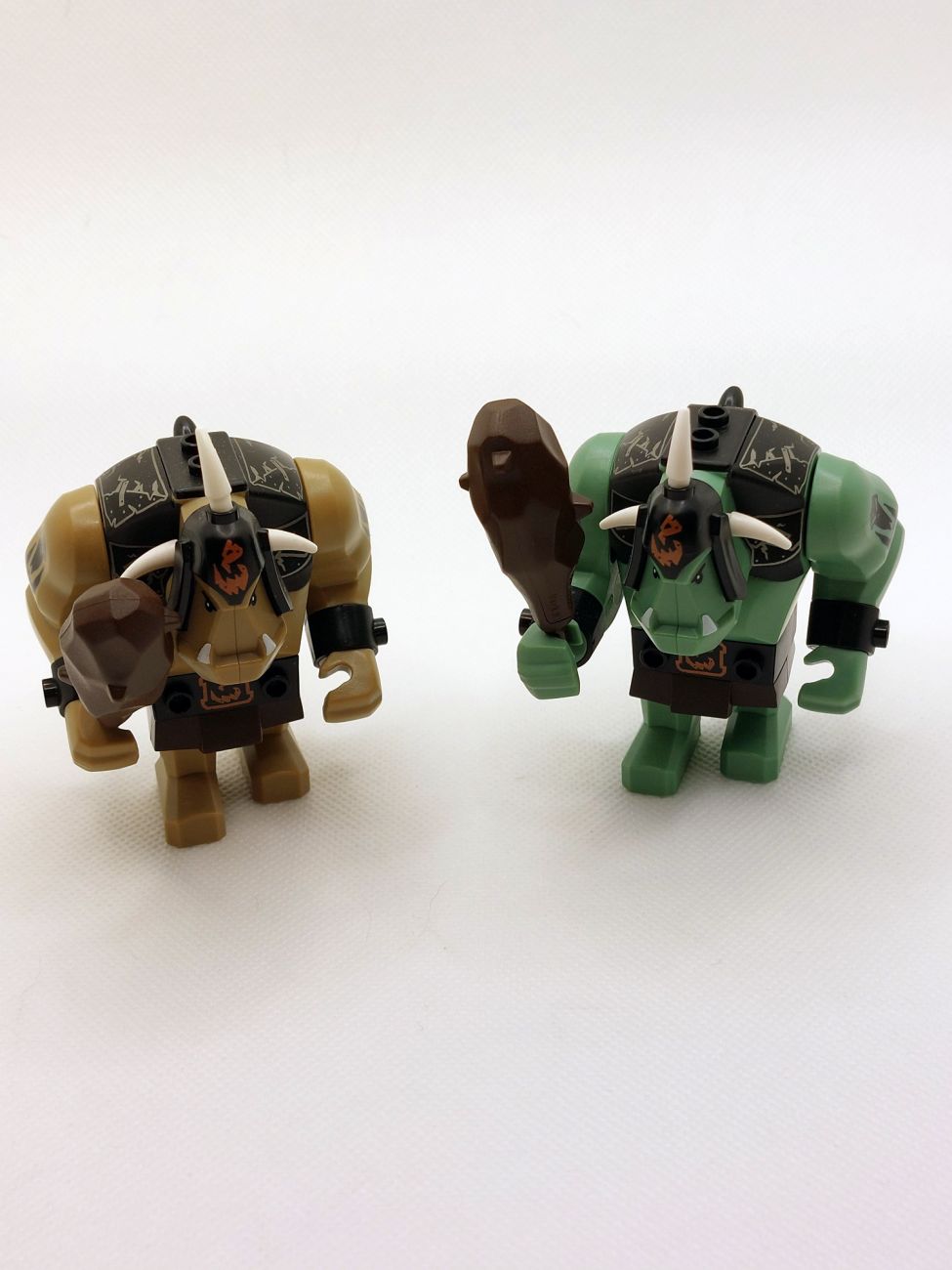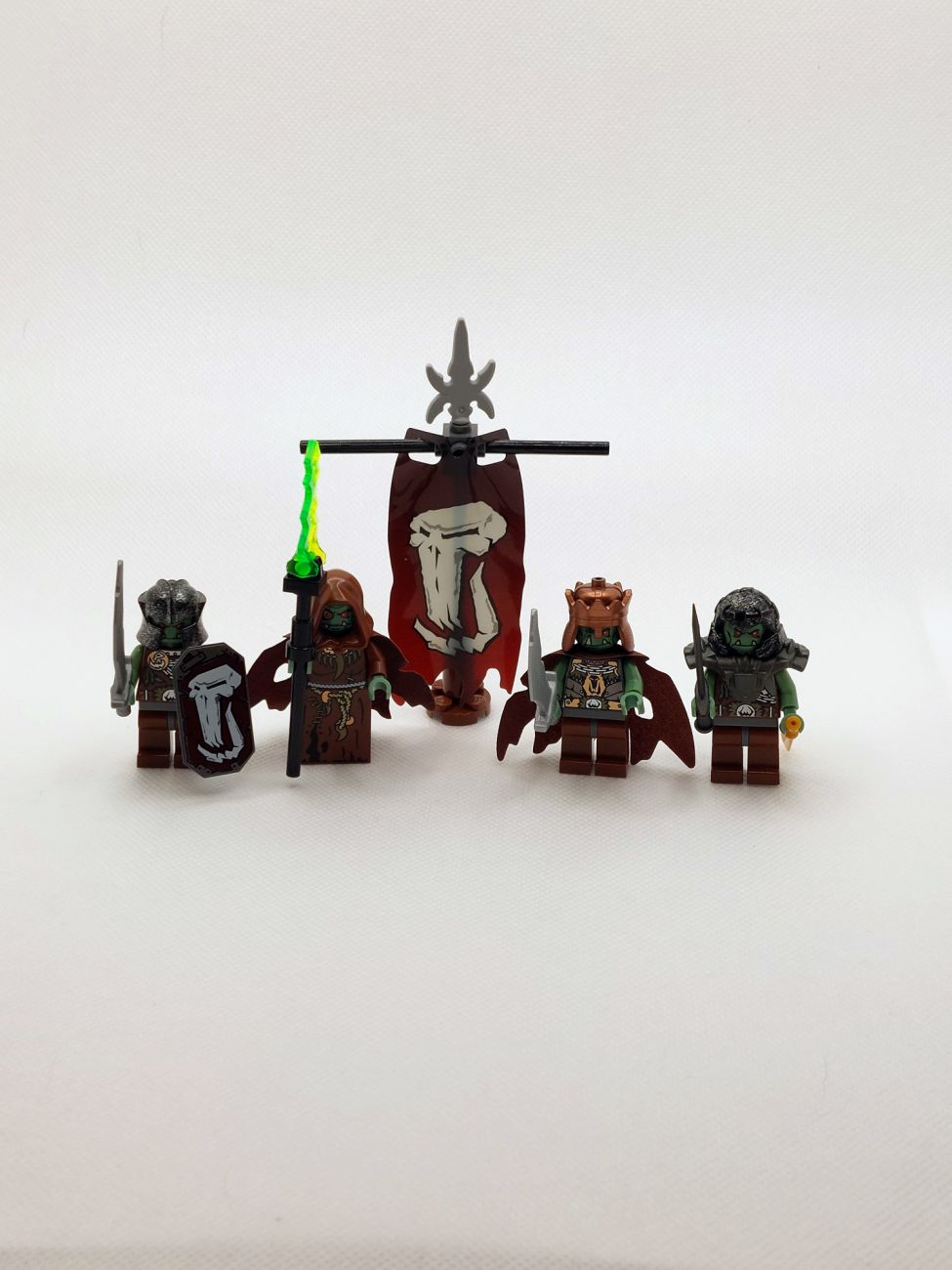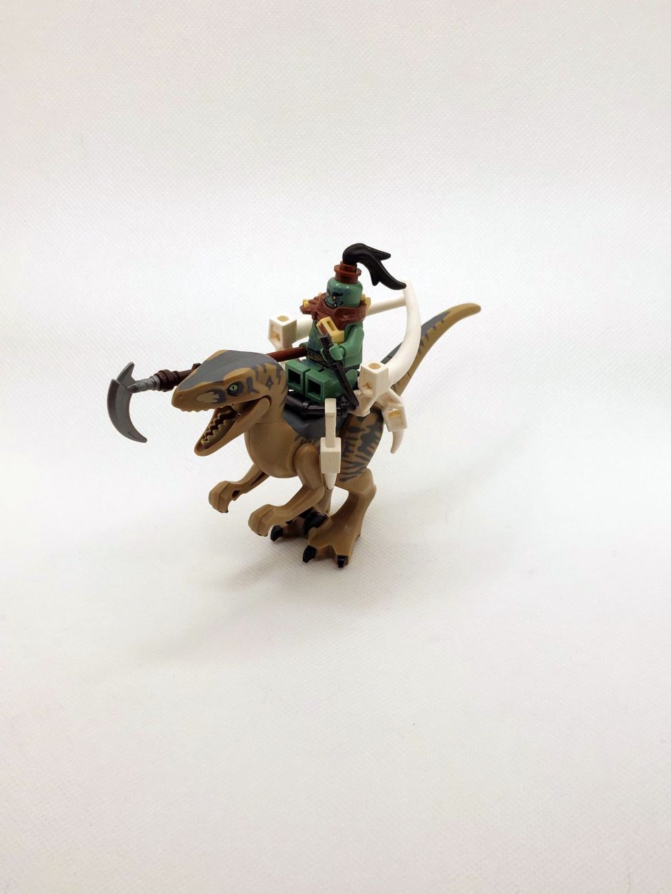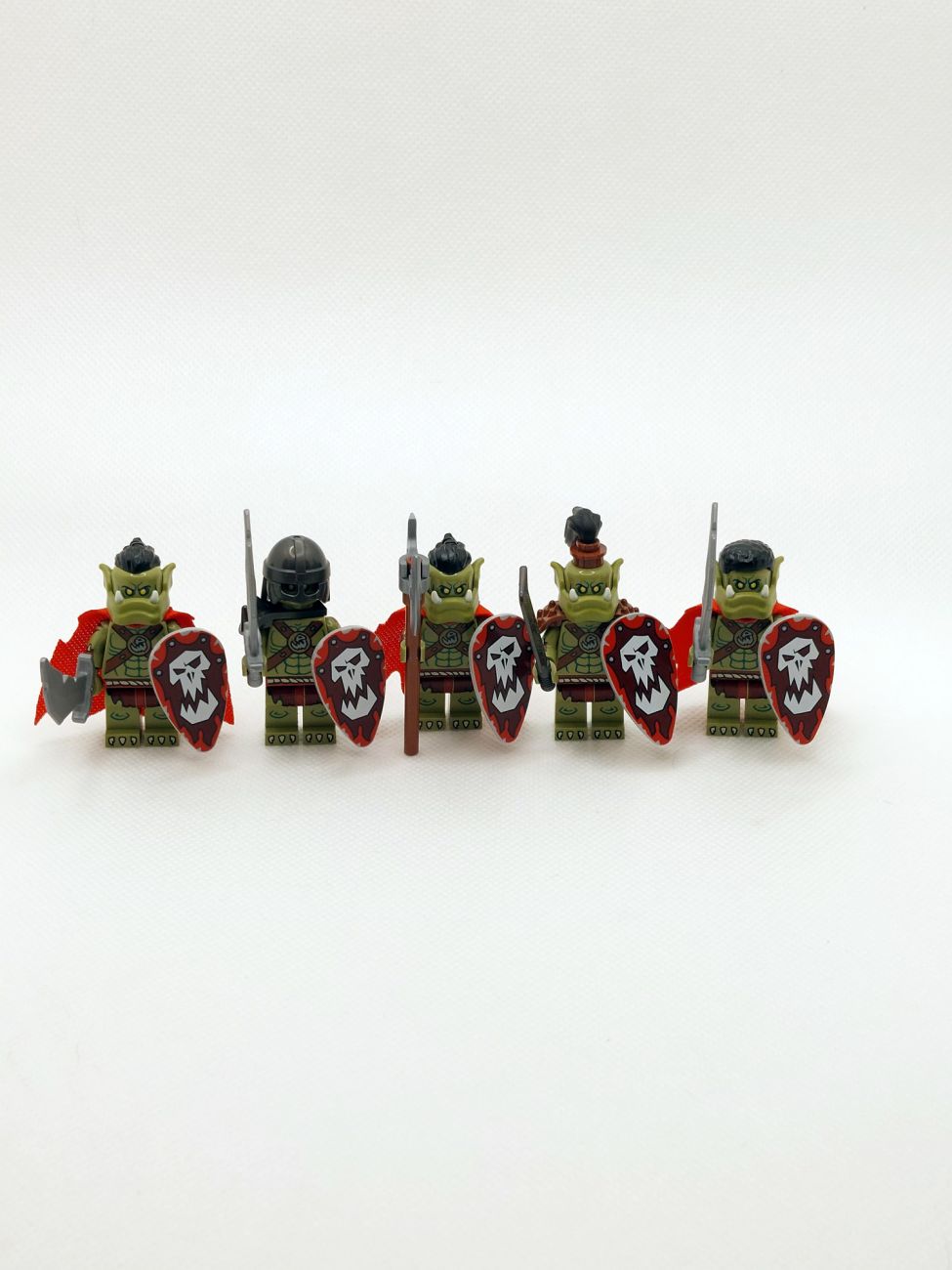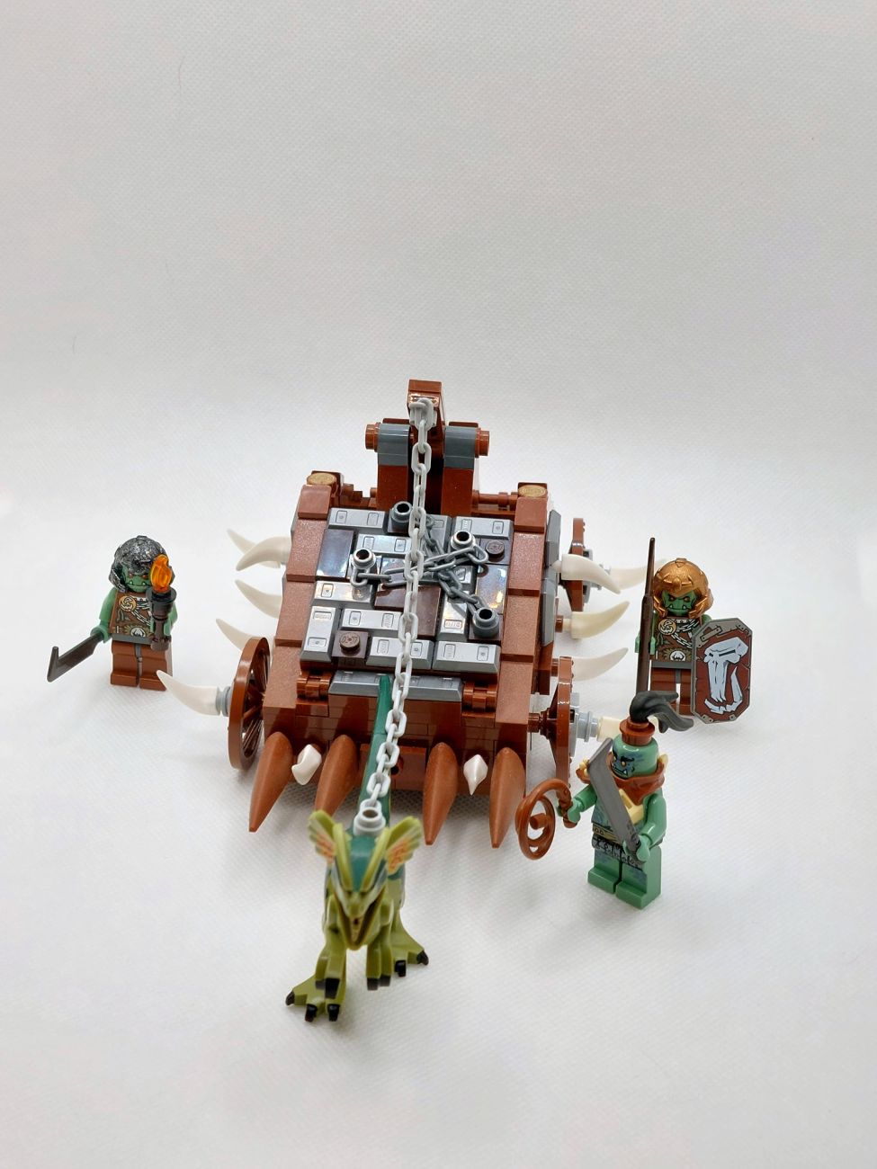 Auch unsere Armee der Untoten entstammt den LEGO-Sets der Fantasy Era Reihe, ebenso wie die Orks in sandgrüner Farbe. Diese mischten wir mit der Ninjago-Figur Murt aus der Master of the Mountain-Reihe, sowie die neu erschienenen olivgrünen Orks aus der CMF 24. Da sich die beiden Grüntöne leider nicht gut mischen, trennten wir sie in zwei Orkheere auf dem Schlachtfeld auf. Da es natürlich langweilig wäre, 40mal die gleiche Orkfigur zu nutzen, modifizierten wir diese auf die unterschiedlichsten Weisen: Als Waffen nutzten wir vor allem Säbel und Uruk-Hai Schwerter, alles Teile, welche zur Entstehungszeit unseres Mocs bei Pick a Brick verfügbar waren. Die Capes der CMF Orks tauschten wir durch, und für einige Orks kauften wir unterschiedliche Rüstungsteile. Wir nutzten auch unterschiedliche Haarteile, sowie Wikingerhelme aus dem Marvel Sanctum Sanctorum, ebenfalls bei Pick a Brick verfügbar. Weiterhin haben wir die Orkarmee mit verschiedenen Dinosaurieren aus den Jurassic Park Sets ergänzt, inspiriert von dem Instagram User ByBeezon, die als Reit- und Zugtiere dienten.