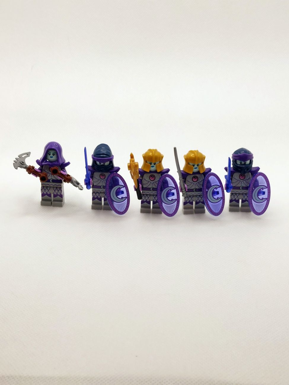 Das letzte Heer, welches wir aufbauten, war ein Heer von Zwielichtelfen, inspiriert vom Tower Defense Spiel Kingdom Rush Origins. Für diese nutzten wir die CMF-Figur Night Protector aus Serie 22. Wir gaben unserem Anführer der Zwielichtelfen einen goldenen Helm, den restlichen gaben wir Kapuzen in Dark Purple, oder verschieden Ninjago Masken (Bricklink: Headgear Ninjago Wrap Peaked Head with Dark Purple Wrap and Knot Pattern, Headgear Ninjago Wrap Type 4 with Molded Dark Purple Headband Pattern). Anschließend bekamen sie noch Rüstungen, was sich anfangs durch die unterschiedlichen Kopfteile der Figuren als schwierig erwies, schlussendlich fanden wir aber eine passende Lösung (Bricklink: Minifigure Armor Shoulder, Pointed Ends). Die wenigen Capes, die wir in Dark Purple hatten, nutzen wir selbstverständlich auch. Somit fehlten also nur noch passende Waffen, die meisten Figuren behielten ihr Trans Purple Schwert, welches regulär bei der Figur dabei ist, manche bekamen aber auch eines der neuen Elbenschwerter aus dem Rivendell Set, oder selbstgebaute Waffen aus unterschiedlichen Ninjagowaffen. Ein passendes Reittier bekamen sie auch noch, einen Skarabäus ähnlichen Käfer, gebaut von Matthias (Brickfreund).